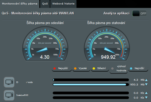 QoS: Standard, na který jsme již u Asusu zvyklí. Můžeme vypnout, tradiční funkce, adaptivní funkce s důrazem na preferovanou činnost (např. hry), vlastní nastavení a konečně - omezení šířky pásma. Dále zde najdete monitor rychlosti celkově i na připojených zařízeních.