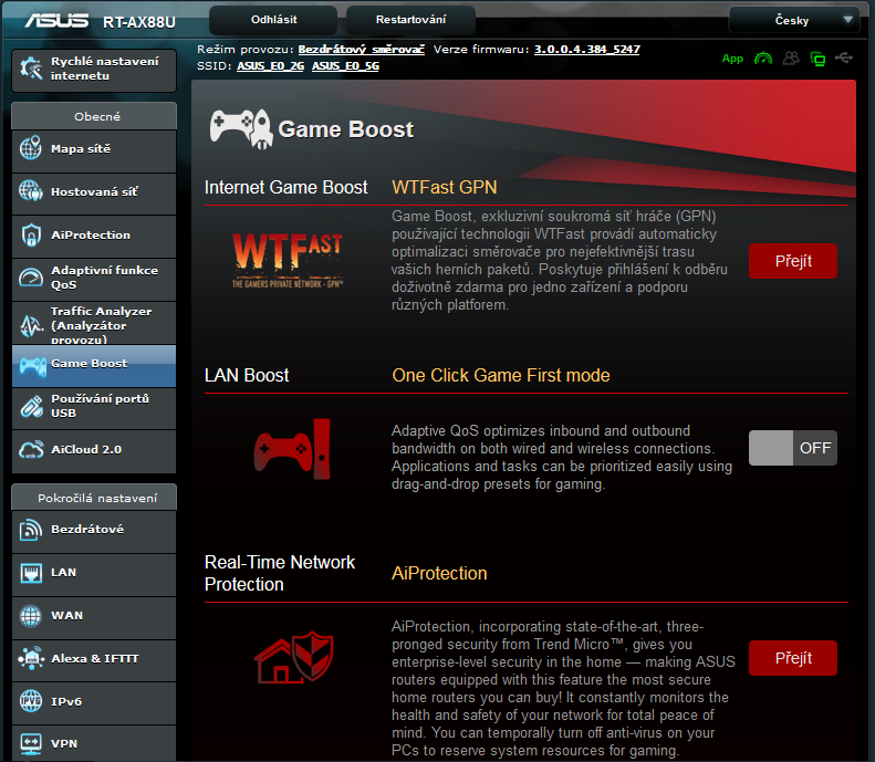 AiProtection: Využívá produktů Trend Micro. Umožňuje nastavení ochrany vaší sítě, identifikuje nakažené zařízení a můžete si nastavit posílání zpráv e-mailem. A také zde najdete i Rodičovskou kontrolu. Plus body za přístup do nastavení přes WAN pouze protokolem https.