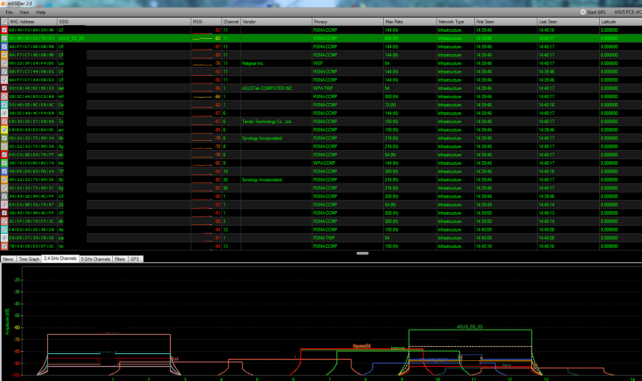 Testování routeru probíhalo v běžných podmínkách, prostým kopírováním souborů. Rychlost kopírování převzata z totalcommanderu. K portu WAN připojen počítač s gigabitovou LAN kartou, SSD disk. Jako příjemce pak počítač s gigabitovou LAN a SSD diskem. Notebook HP ProBook s WiFi kartou podporující 802.11n. Jako další WiFi karta použita https://www.asus.com/cz/Networking/PCEAC68/ ve stolním PC s SSD diskem. Jako USB zdroj byl použit flashdisk Corsair VoyagerGT USB 3.0. Písmena značí vzdálenost od routeru. A = 1 m, B = 4,5 m, jedna dělící zeď, C = 9.5 m, tři dělící zdi. A že to router neměl zrovna jednoduché, můžete vidět ze screenu InSSIDeru - celkem 30 WiFi sítí