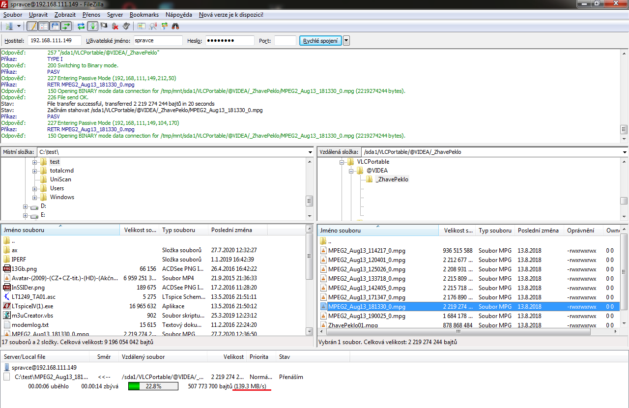 U samby je velká režie, zkusil jsem proto i test FTP. Zde jsem byl velmi příjemně překvapen - odezva je až neuvěřitelně rychlá, přechod mezi adresáři zabere doslova mžik. Rychlost stahování souboru je zřejmě maximální, co lze z mé sítě dostat - 139 MB/s, což je 1112 Mbps! Jako klient jsem použil FileZillu.