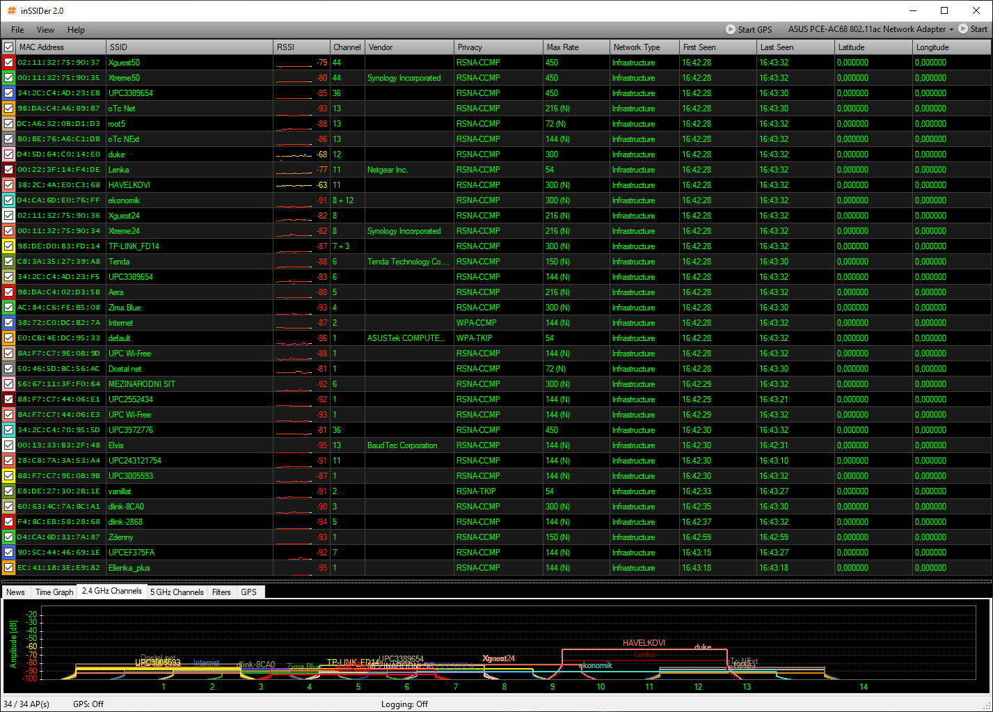 A pro úplnost dodávám screen z programu InSSIDer, aby jste měli představu o tom, v jakých podmínkách byl router testován. Sami můžete vidět, že volný kanál neexistuje.