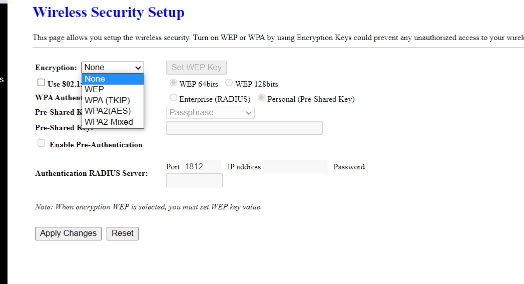 V okýnku wireless security setup jsem zadal "WPA2 MIXED"