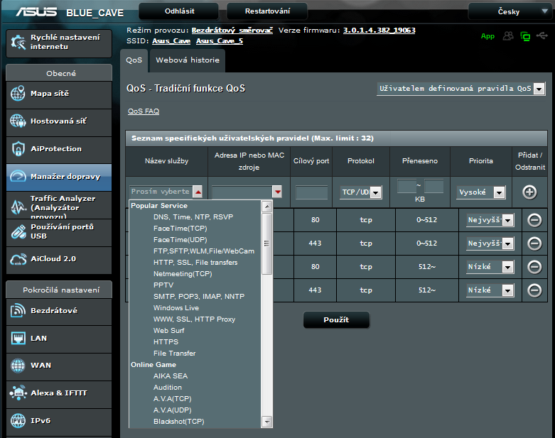 Manažer dopravy - zde se skrývá funkce QoS. Tu můžete provozovat buď v tradičním režimu, nebo jako omezovač šířky pásma. Požaduje zadání parametrů vašeho připojení. Pak si můžete uživatelsky nastavit prioritní připojení pro vaše důležité pakety. A to jak pro internetové služby, tak pro online hry. Seznam her je opravdu obsáhlý. USB port nabízí opravdu široké možnosti využití: