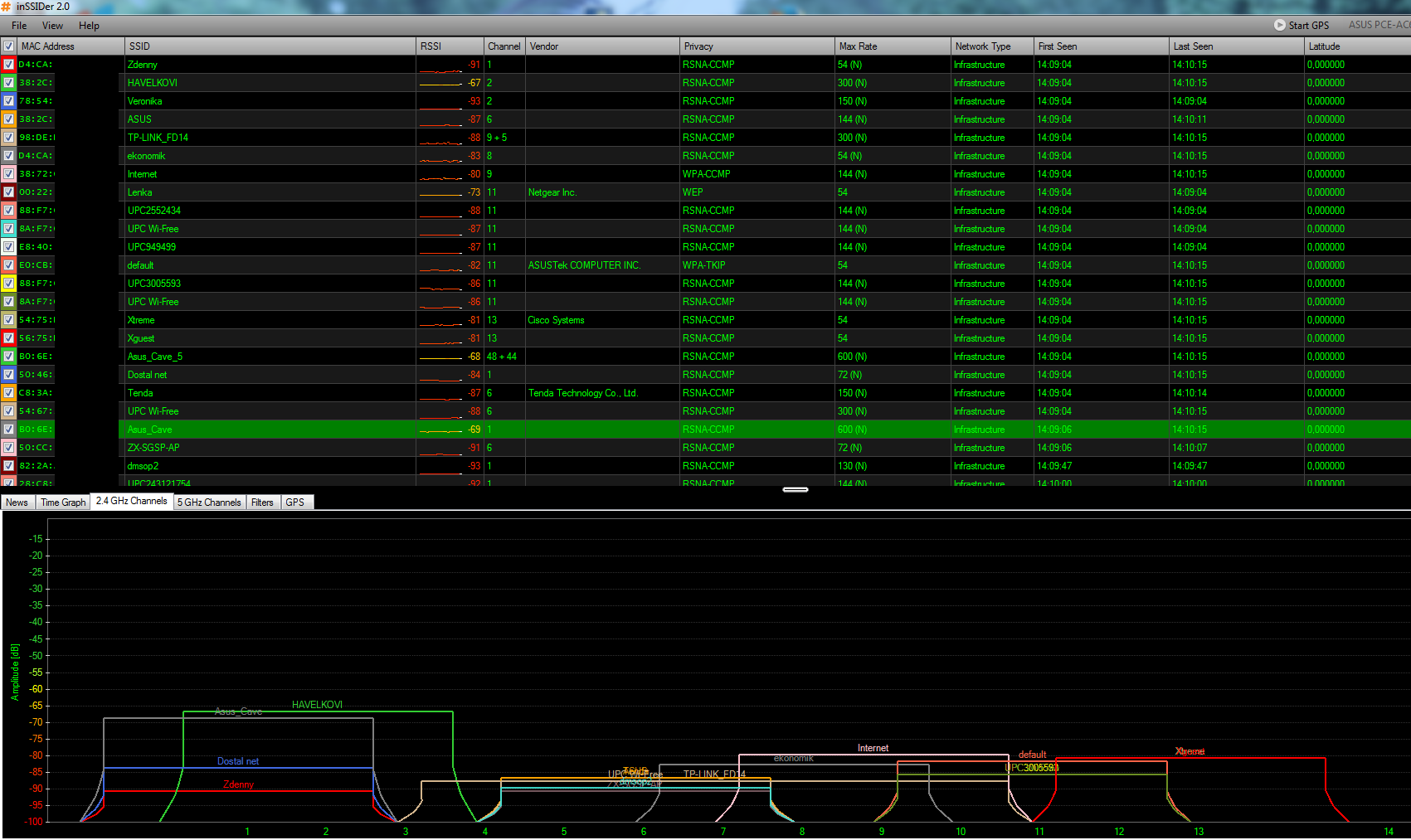 Další novinkou je možnost eliminace rušení WiFi portem USB 3.0. Zařízení USB 3.0 používají frekvenci 2,5 GHz, což je blízko frekvenci 2,4 GHz, na které funguje WiFi. Asus myslel i na tohle, proto nabízí v nastavení možnost omezení tohoto rušení. Často dotazovaná vlastnost u routerů je i monitoring navštívených internetových stránek. Pro tento router to není žádný problém. Testy - v mezích svých možností jsem router otestoval. WAN port připojen do gigabitové sítě, zdroj stolní PC s SSD diskem. Druhý počítač byl notebook s SSD diskem a PC se síťovou kartou AC68, opět s SSD. "Měření" berte orientačně, těžko se mi v domácích podmínkách podaří vždy splnit stejné, natož ideální podmínky. Zvláště pak, když v okolí mám na dvacet WiFi sítí v pásmu 2,4 GHz (v pásmu 5 GHz jen jednu). Pro úplnost dodávám, že měření "A" je 1m od routeru, "B" 3m od routeru přes zeď, "C" 8m od routeru přes tři zdi. K měření rychlosti USB je použit flash disk Voyager GT USB 3.0. Rychlosti zde uvedené jsou reálné rychlosti kopírování souboru ukázané totalcommanderem. Pro pořádek dodávám, že při měření bylo omezení rušení USB portem vypnuto a v portu nebylo připojeno žádné zařízení. A pro představu jak vypadá WiFi okolí panelákového bytu: Co říci závěrem? Jedná se o skutečně povedený kousek disponujícími pokročilými funkcemi přesahující běžné routery. Možnost ovládání mobilním telefonem, široké možnosti využití USB portu, rodičovská kontrola, log připojených zařízení, log navštívených www stránek, ovládání hlasem pomocí Amazon Alexa, nastavení reakcí pomocí IFTTT, atd. Nemluvě o zcela specifickém designu. Rok záruky navíc. To vše za cenu 6.499,- (czc), což pro ty, kdo funkce využijí rozhodně není přemrštěná cena.