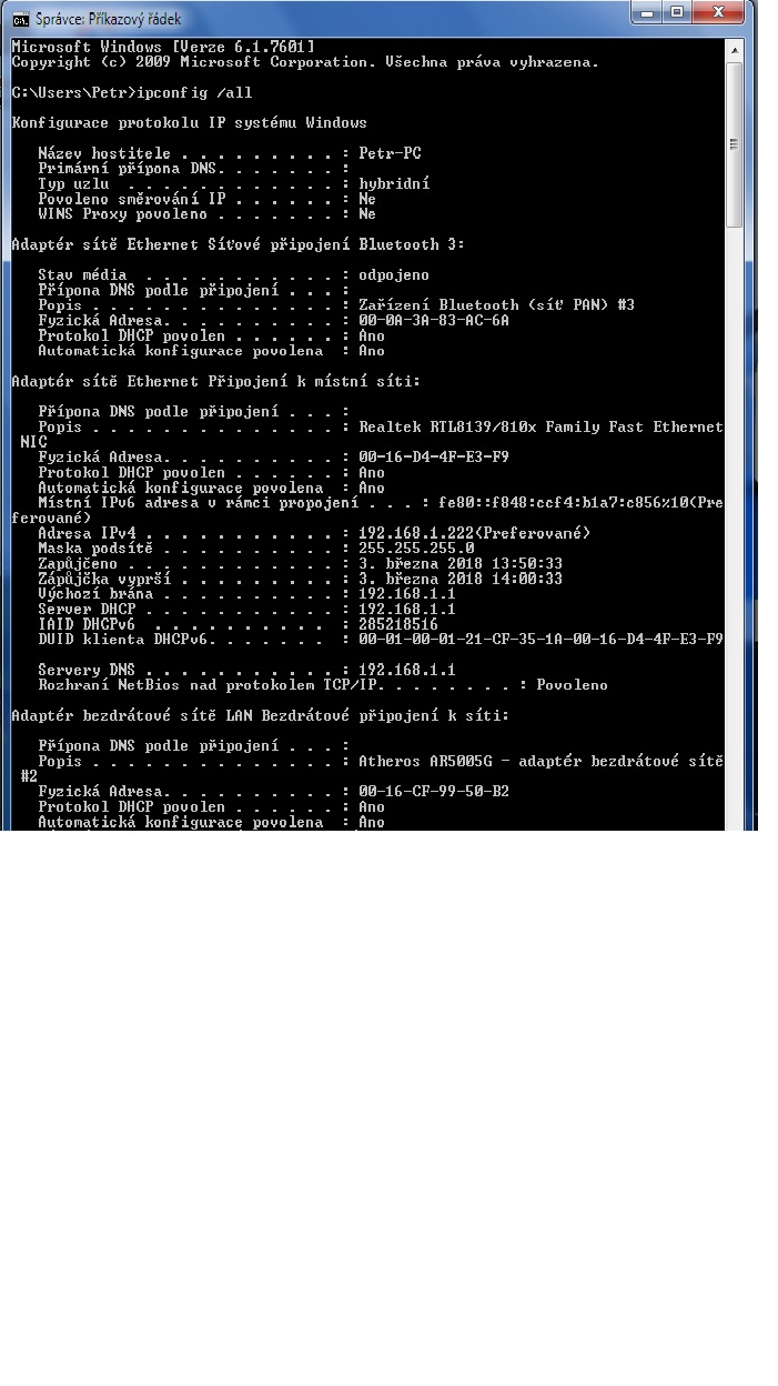 Takže jsem zkusil připojit kabelem NTB s modemem a spustil příkaz "ipconfig /all" a zde je výpis: