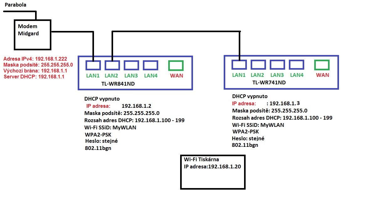 Mám od Midgardu bezdrátové internetové připojení parabolou, z ní vede UTP kabel do jejich „černé skříňky“ (modem), ze které už mi jde klasický UTP kabel do Wi-Fi routeru TL-WR841ND, který pracuje v režimu vypnutého DHCP serveru s výchozí bránou 192.168.1.2 (maska podsítě 255.255.255.0). Rozsah adres v nastavení DHCP je 192.168.1.100-199 (nevím, zda je to důležitý parametr, když je DHCP vypnuté). Přívodní kabel z černé krabičky je zapojen do LAN portu, WAN nezapojeno ani nenastaveno. Pevné připojení kabelem z LAN portu na stolní počítač funguje, Wi-Fi připojení na telefony a NTB v nejbližším okolí také. Používám Wi-Fi tiskárnu HP 3050 s pevně nastavenou IP adresou 192.168.1.20, u které se mi občas stává, že na počítačích vyskočí varovná hláška: „Skenování do počítače není aktivováno“ (jakoby router na chvíli ztratil spojení s tiskárnou). Je to jev, který třeba do deseti vteřin sám odezní a spojení je dále v pořádku, ale začíná se ten problém objevovat stále častěji.