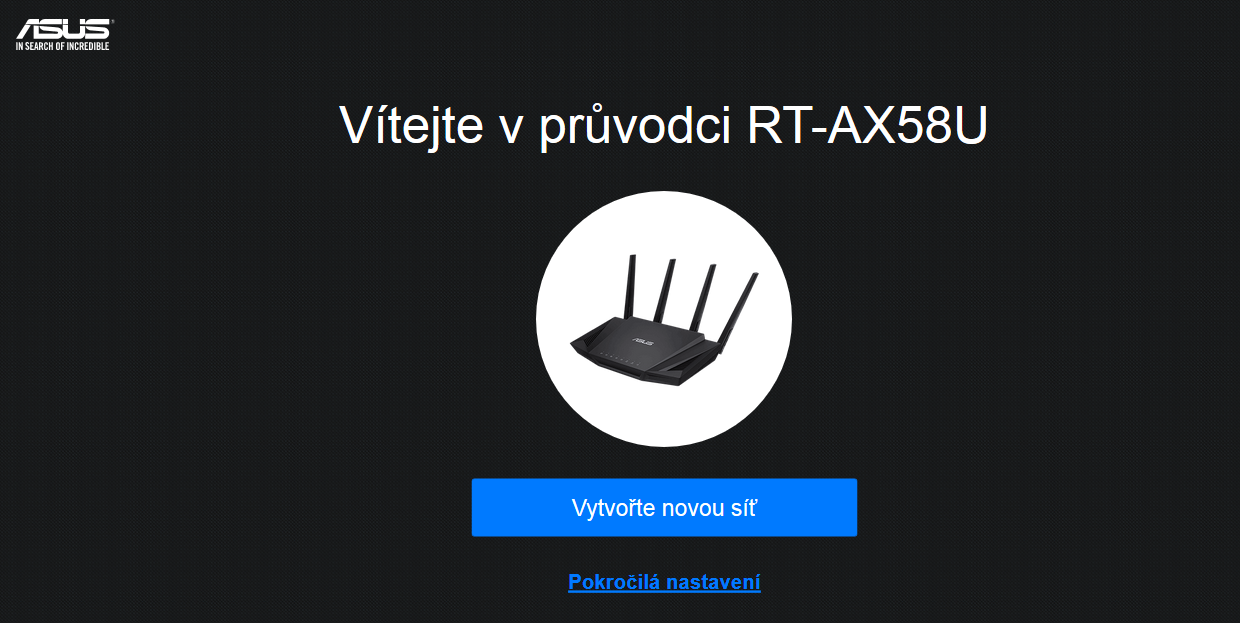 Hardware routeru: router je osazen 256 MB flash ROM, 512 MB DDR3. Srdcem je procesor tříjádrový Broadcom BCM6750, tepající na frekvenci 1,3 GHz. O WiFi 802.11ax se stará další procesor Broadcom BCM43684. Roter disponuje čtyřmi gigabitovými porty LAN, jedním gigabitovým WAN portem, jedním portem USB 3.1 a čtyřmi anténami. Všechny porty jsou umístěny na zadní straně. Nastavení je jednoduché - stačí do adresního řádku prohlížeče zadat router.asus.com a ohlásí se úvodní obrazovkou:O další se postará průvodce, který vás provede nastavením. Vyžadována je změna hesla pro přístup k routeru a nastavení přístupu k WiFi. Ostřílenější uživatelé přejdou rovnou k pokročilým nastavením.