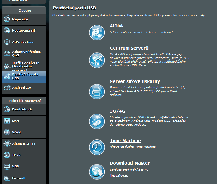 - Centrum serverů - samba (sdílení windows), FTP, DLNA a další. Je třeba mít připojený USB disk.