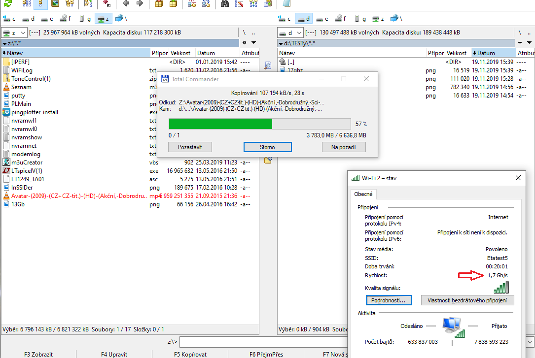 Zde se můžete přesvědčit, že reálná rychlost kopírování souboru je 107 MB/s, což je srovnatelné s gigabitovou LAN sítí (kabel). A všimněte si navázané rychlosti spojení - 1,7 GHz! Ještě dodávám screen z programu InSSIDer, čistě jen pro představu, s čím se router musel "poprat". Co dodat závěrem?