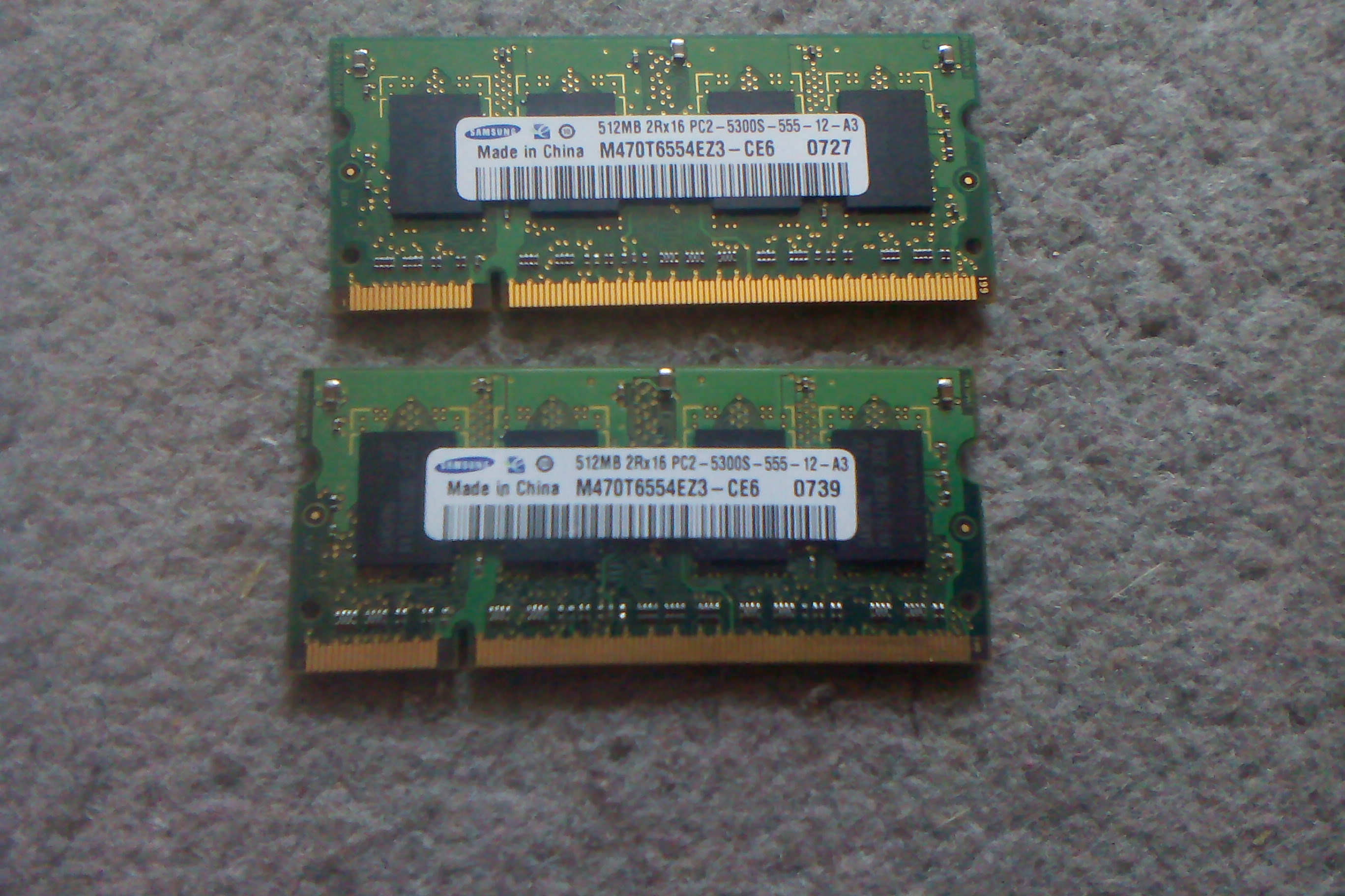 Objevil jsem, že mám v notebooku tyto dvě ramky (viz foto). Obě jsou 512 MB, DDR2, rozdíl je jen ve dvou číslech.