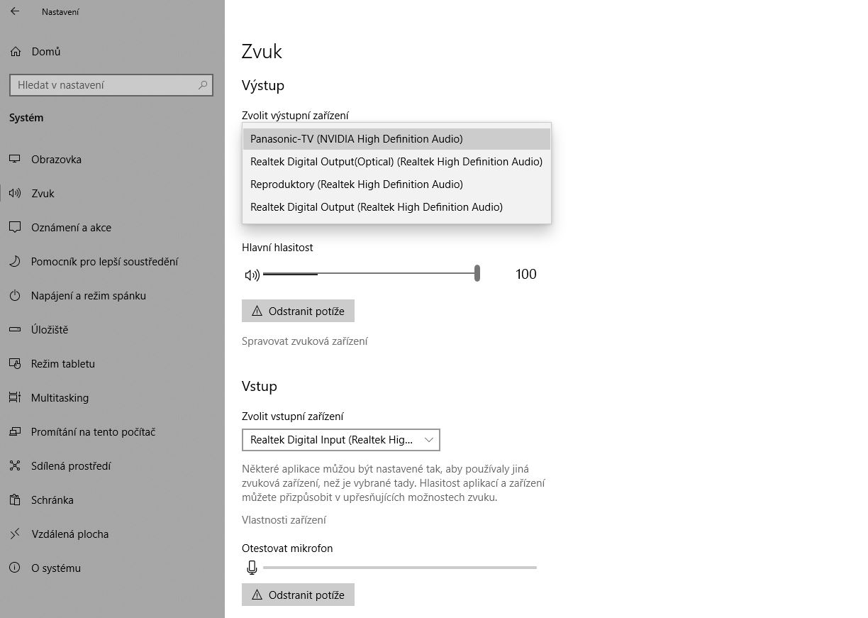 No a nakonec jsem ještě potřeboval vyřešit problém se zvukem. Chtěl jsem aby při používání pc hrály bedničky co budou u monitorů a při přehrávání filmu na tv aby hrála tv. Toto nastavení jsem našel v nastavení zvuku, kde mám možnost vybrat mezi reproduktory a TV.