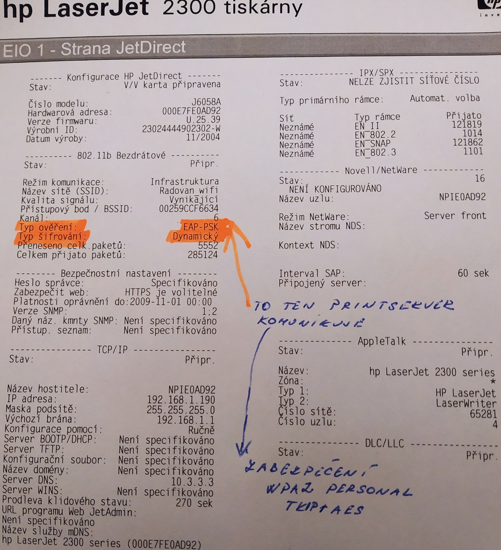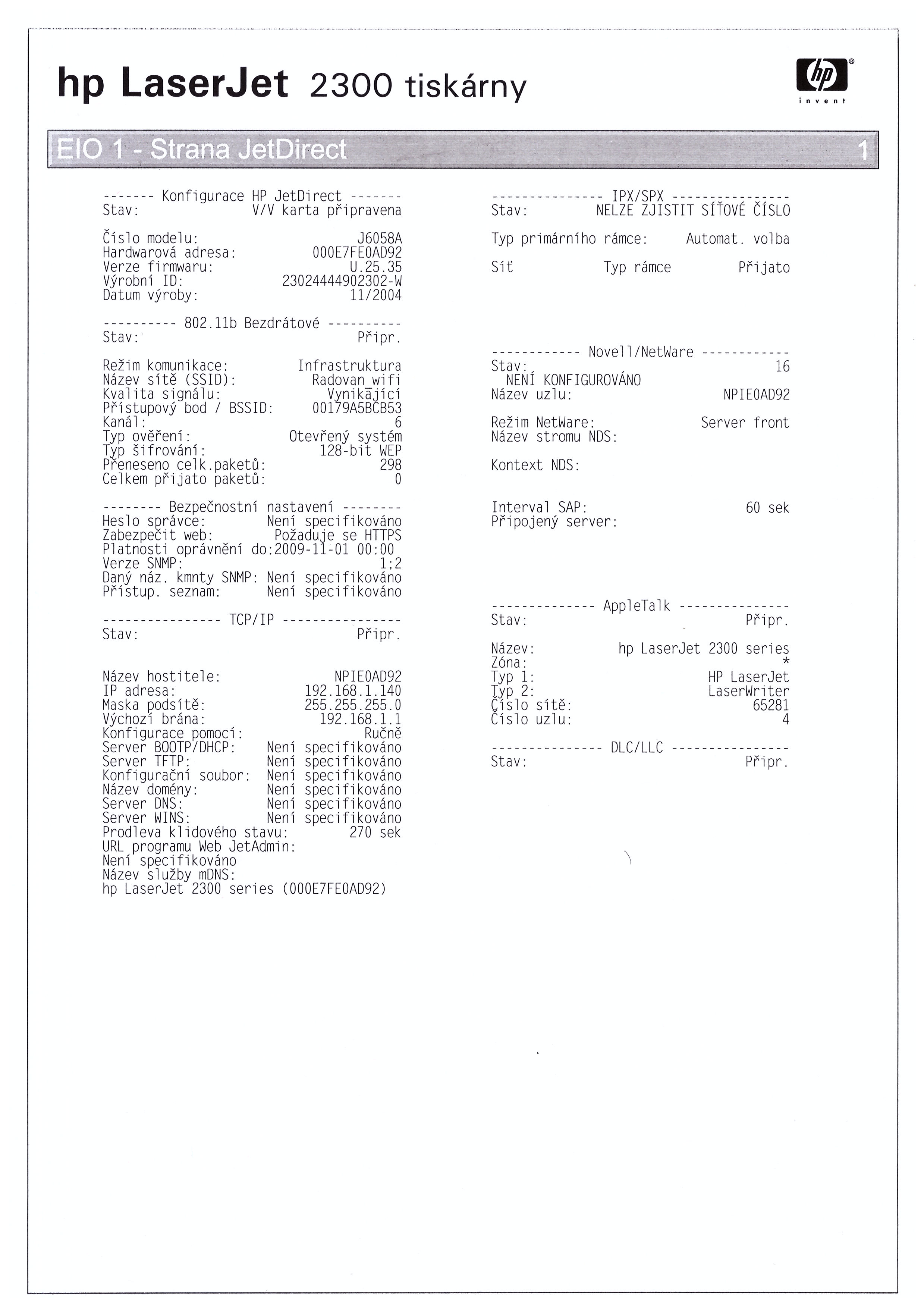 Vytisknul jsem stránku kde je ten JetDirect v té tiskárně a už to tam nahoře píše: