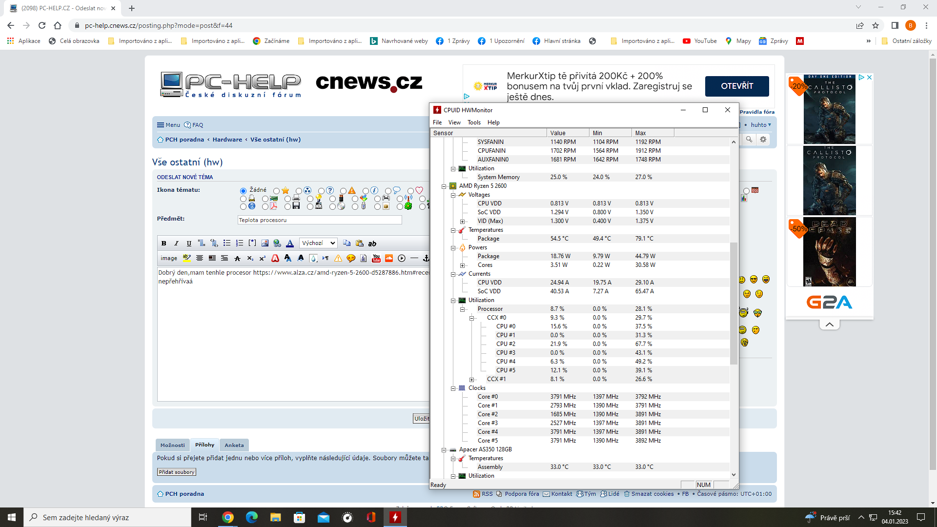 Dobrý den,mam tenhle procesor https://www.alza.cz/amd-ryzen-5-2600-d5 ... ecenze,chi se zeptat zda teploty procesoru jsou v pořadku,zda se mi procesor nepřehřívaá