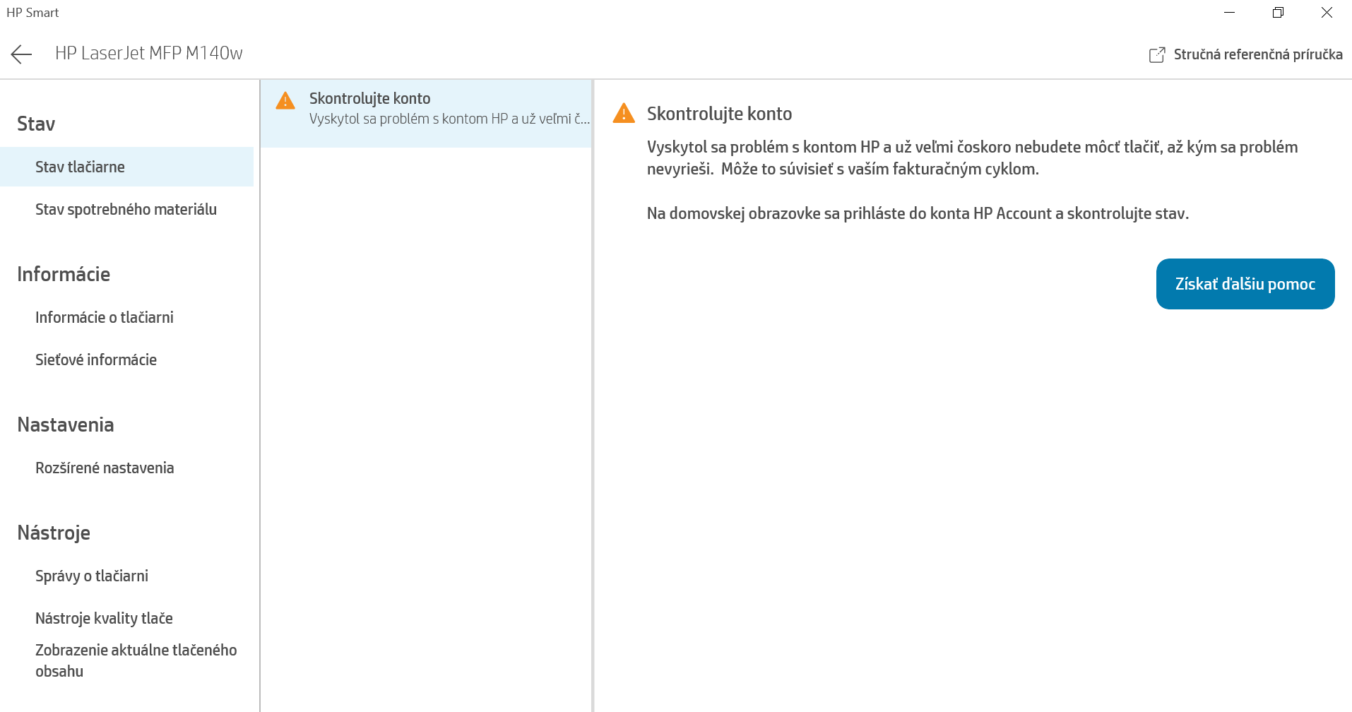 Mam tlaciaren HP LaserJet MFP M140w, ktoru som bezne pouzival a nebol s nou nejaky vacsi problem. V pondelok som tlacil nejake dokumenty, cca 1 list A4 za 20 minut. Vsetko fungovalo v poriadku, ale zrazu (bez vypnutia PC/tlaciarne/routera) zacal na tlaciarni blikat oranzovy vykricnik a prestala tlacit. Pise mi to, ze mam skontrolovat HP konto a tam sa dozviem viac. Bohuzial, HP konto mi ziadny KONKRETNY problem nevyhodi a ja vobec neviem, ako to riesit.