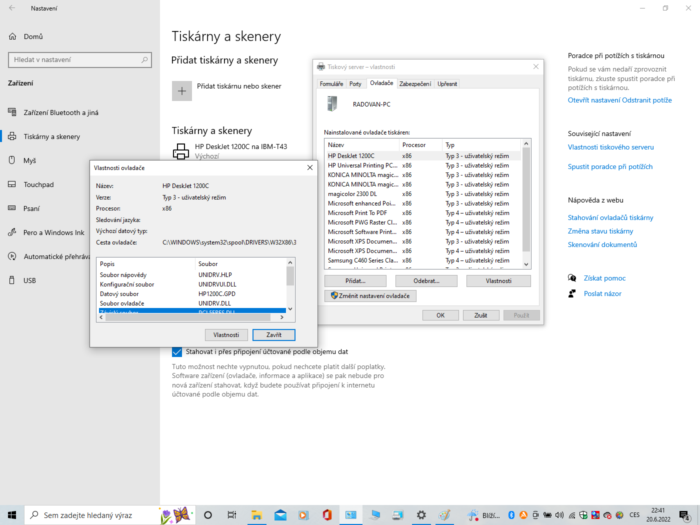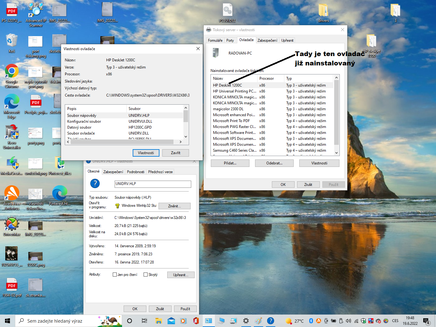 Když dám vlastnosti tiskového serveru tak na prvním místě je ovladač ten HP Deskjet 1200C