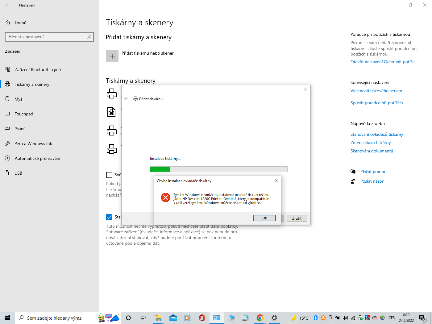 • Tiskárna HP M433nda na lan se nainstaluje, ale je ofline