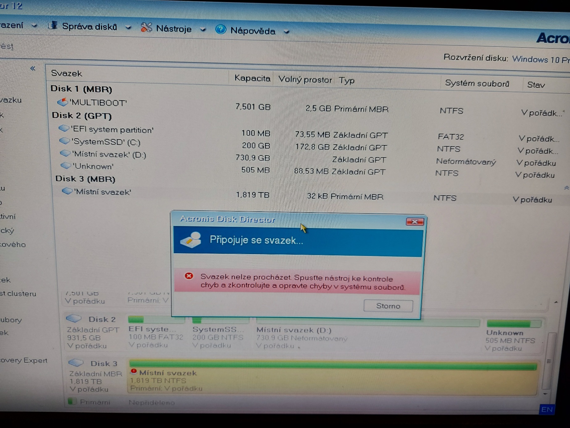 Když ale dám v acronisu připojit svazek, píše, že svazek nelze procházet, chyba v systému souborů. Acronis recivery expert také nevidí nic k opravě.