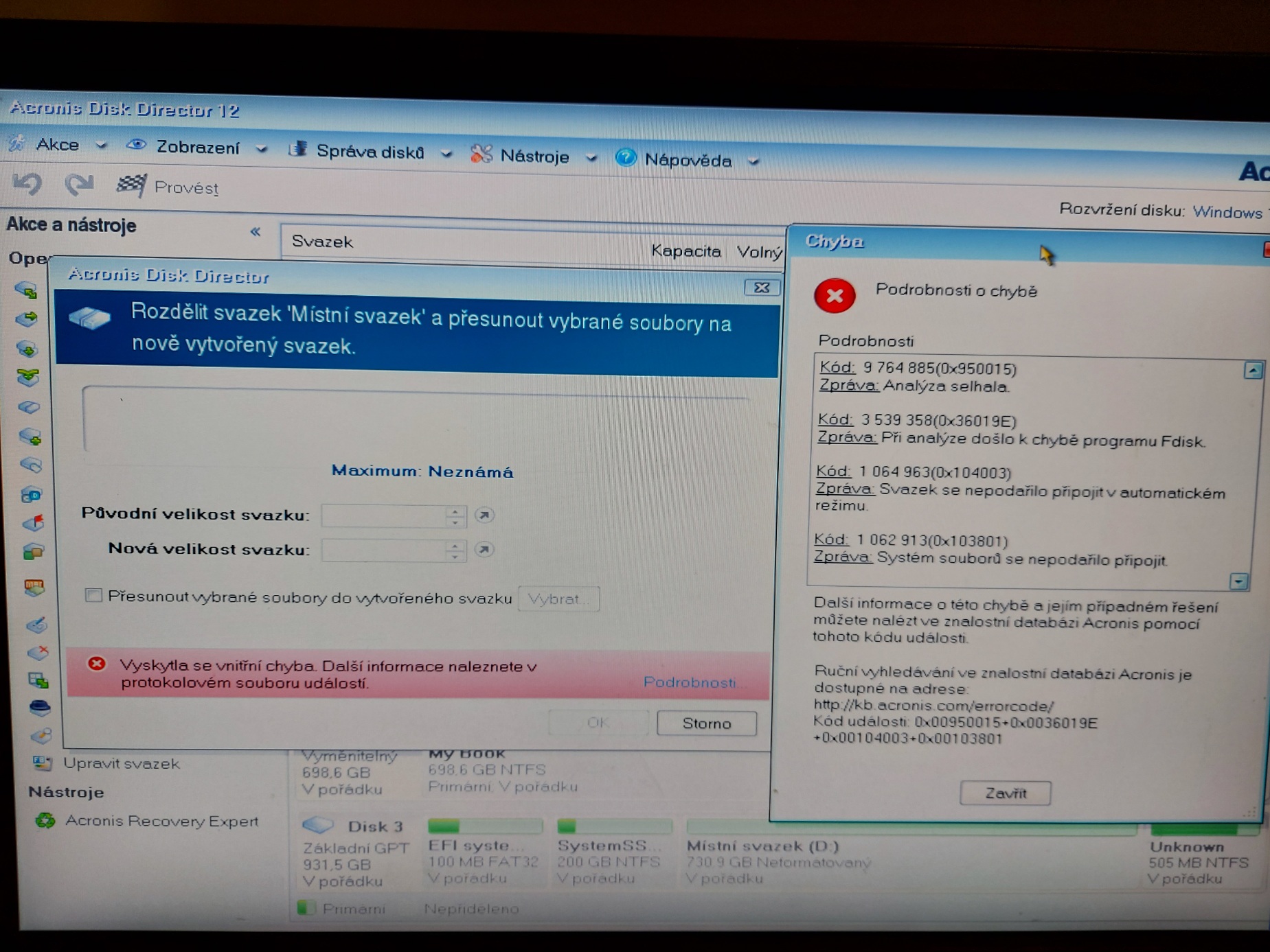 Např když dám rozdělit svazek, chyba viz příloha .