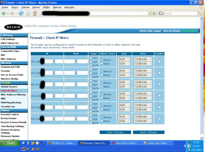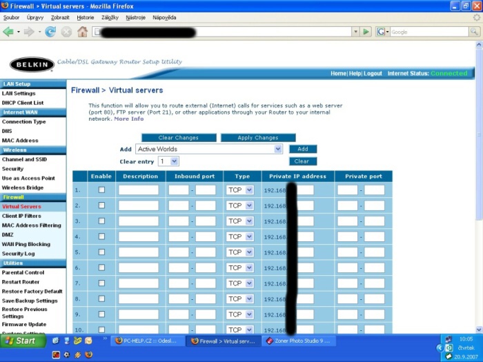 tak vlez do nastaveni toho prvniho obrazku... prvni políčka IP, tam dej IP adresu, kterou ti pravdepodobne přideluje dhcp routeru (zjistis prikazovy radek-> a prikaz ,,ipconfig/all") ... jestli je to třeba 192.168.0.3 a kamos bude mit 192.168.0.5 tak tam dopln aby to bylo ,,192.168.0.3~5 " ... jako port dej port, ktery je napsany v nastaveni Strongu pod TCP, nejaky si vymysli na jednom PC třeba 12345 a na druhym 12346 , a do nastaveni routeru polžky Port napiš 12345~12346 .... pak zaškrtni TCP .. .nech povoleny cely tyden .. zaškrtni Enable .... to sami udelej pro UDP .... Dole dej ,,Aply changes" a hotovo. V Dc potom dej položky aktiv.TLS si nevšímej.... už jsem tu několikrat radil, tak kdyby to nešlo, zkus pohledat v tutom fóru, mockrát se to tu řešilo
