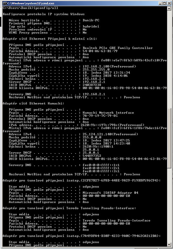 Tady posílám z příkazového řádku svůj ipconfig, pokud to k něčemu bude.