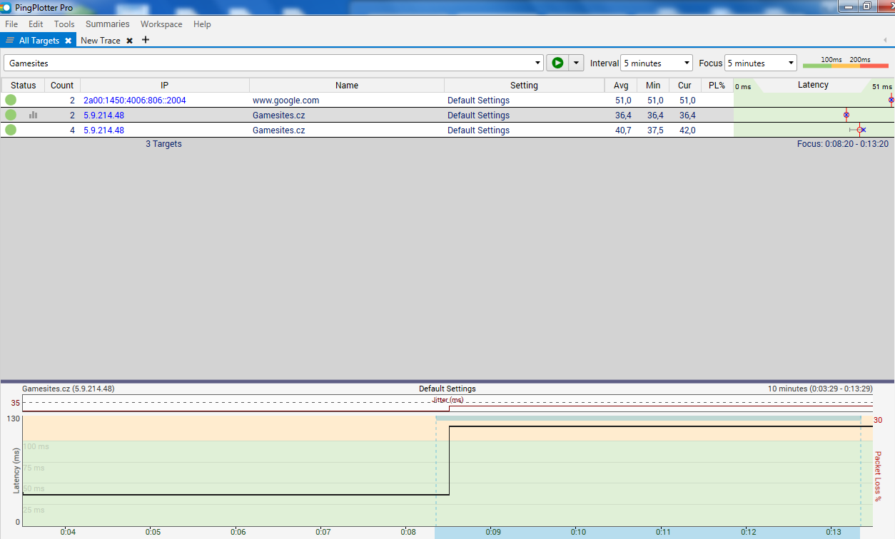 Můžeš vyzkoušet pingplotter třeba na zoznam.sk, ale předpokládám, že to bude naprosto bez problémů.