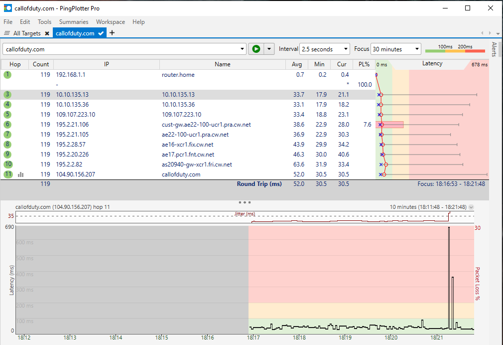 Můj konkrétní problém je že při hraní mám občasné lagy viz. ten graf vždy tam skočí vysoký ping jen na vteřinku a pak zase dobrý, ale při hraní třeba CoD MW to je velký problém.