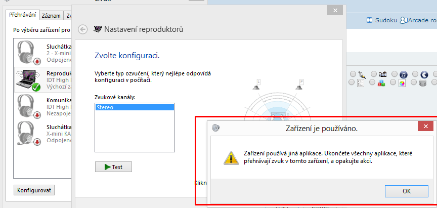 chtěl jsem se zeptat zda-li někdo nevíte čím by to mohlo být, ale když zapnu notebook někdy mi fungují zvuky a někdy ne, když fungují, já ho zaklapnu a otevřu tak potom už nejdou.. Když dám testovat reproduktory, vyskočí na mě toto http://prntscr.com/43atqf ("Zařízení používá jiná aplikace.Ukončete všechny aplikace, které přehrávají zvuk v tomto zařízení, a opakujte akci.") jenže já nemám žádnou aplikaci co používá zvuk zapnutou, teda alespoň o tom nevím.. Budu vám hrozně vděčný, jestli mi někdo zvládnete poradit.. chceme streamovat, ale neslyším zvuk ze hry, z ničeho.. -_- Děkuji!