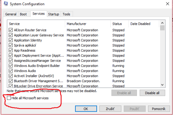 Kde dole kliknu na Hide all Microsoft Services?