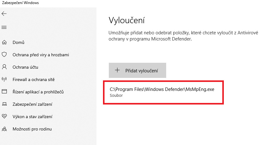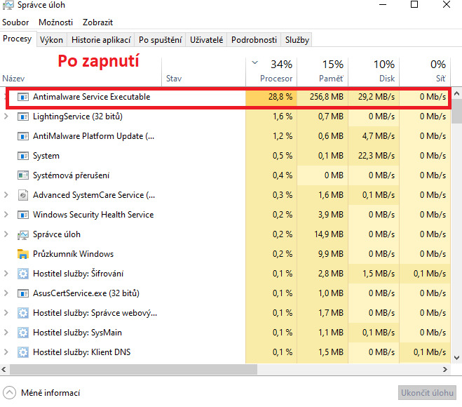 Podle Správce Úloh má největší využití procesoru po startu PC proces "Antimalware Service Executable". Hledal jsem na internetu a zkoušel jsem pár věcí a i přidat to do Vyloučení v "Zabezpečení Windows".