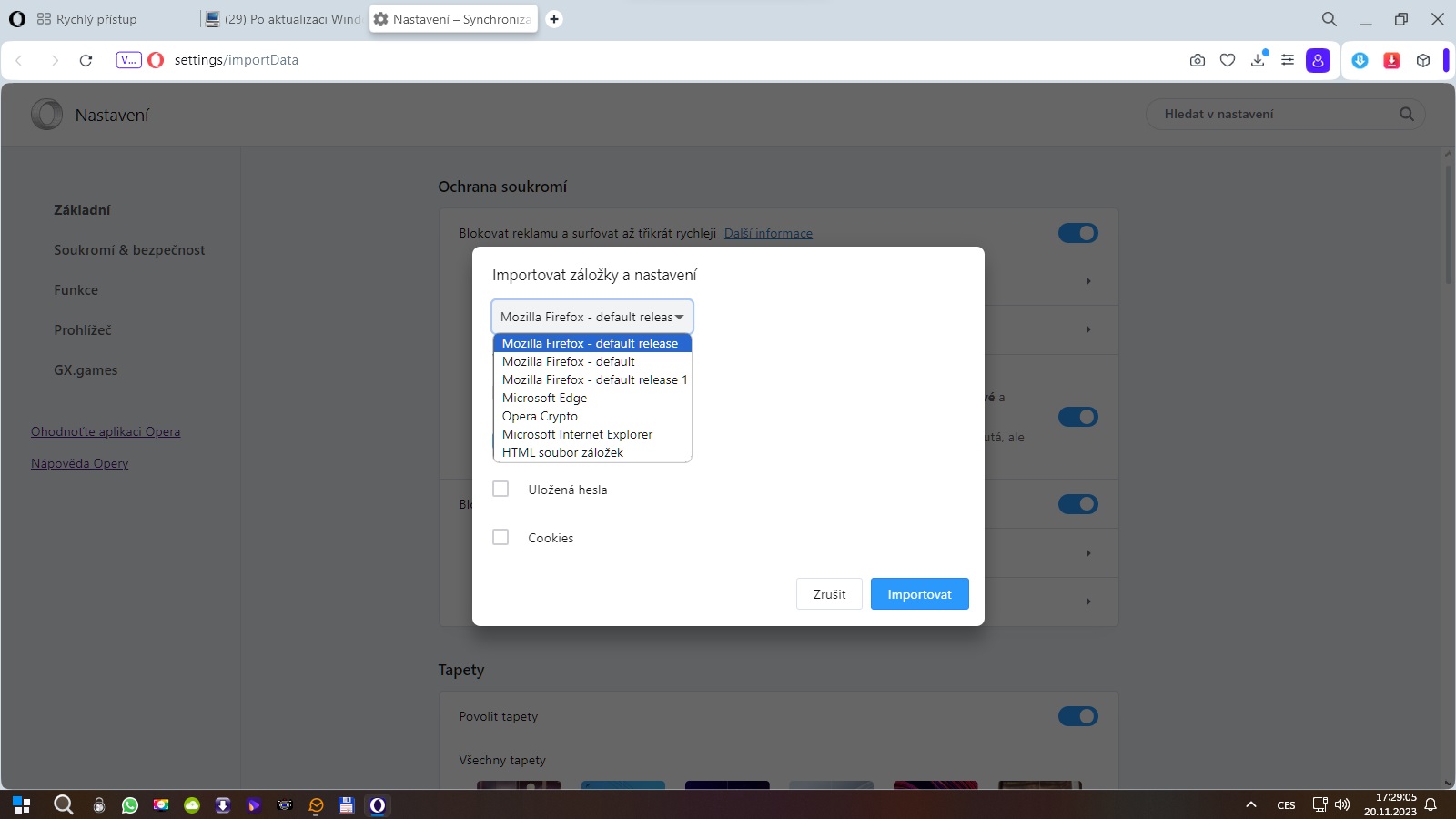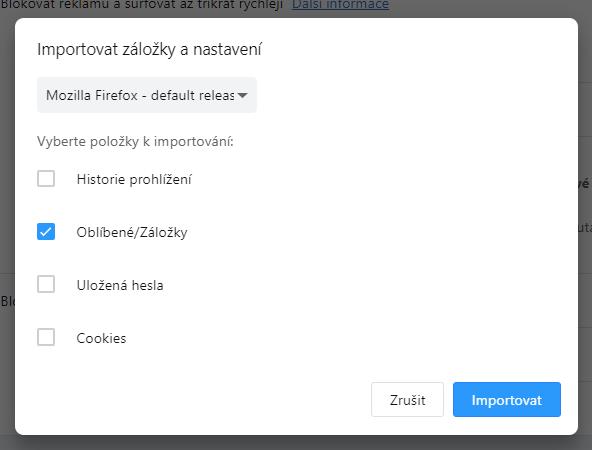 Ten horni screen je mirne zavadejici, protoze je to import z profilu jineho prohlizece na temze stroji.
