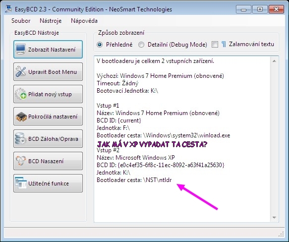 a dvakrat bcdedit /set {ntldr} ..... - pro jeji nastaveni