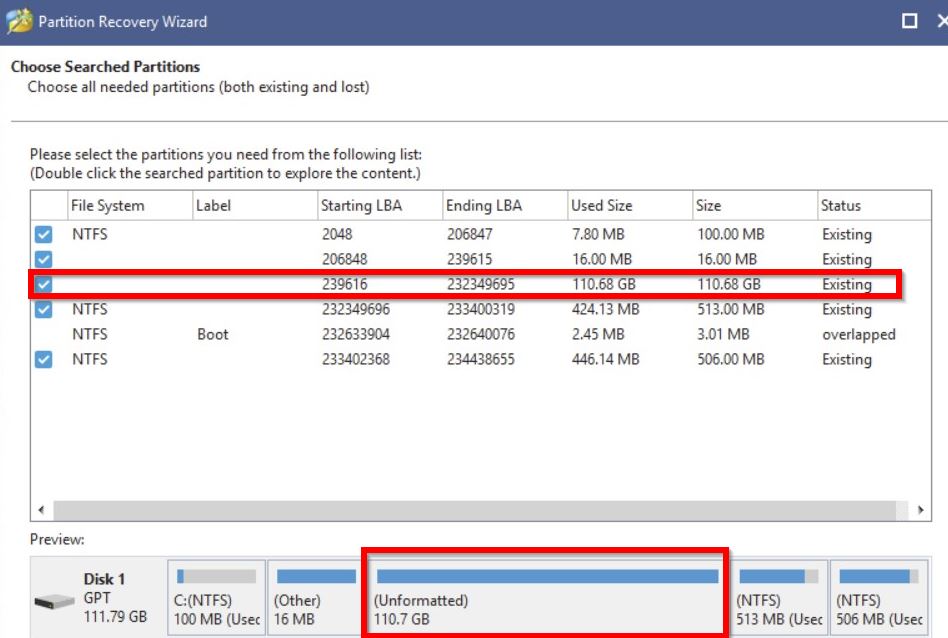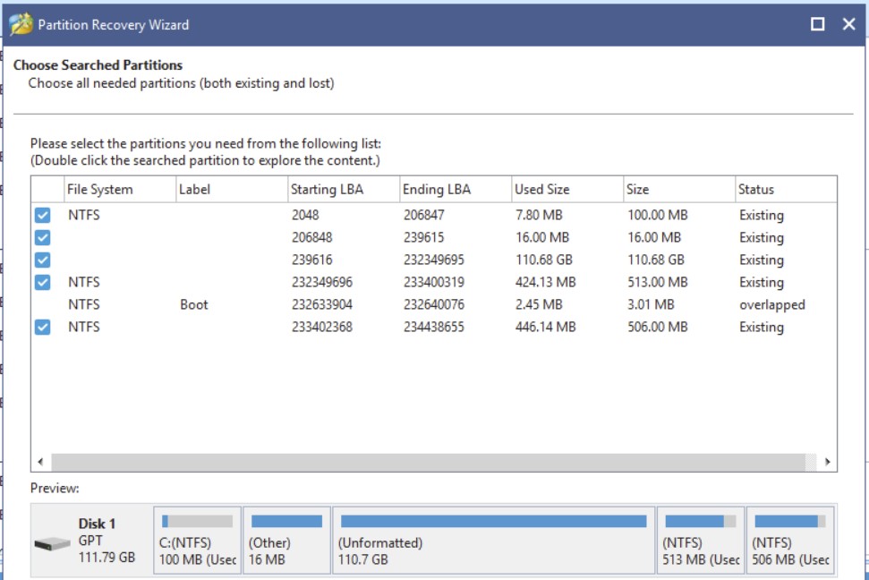 Ja by som si z toho posledného screenu nechal označenie iba na na partícií 110,68GB a spustil finish.Veď iba to potrebuješ obnoviť.Ostatné oddiely zostávaju tak.Veď sú v poriadku.Ešte jedna skúška v tom AOMEI.Tam neponúka obnoviť to ,čo nieje stratené,zmazané.Akurát pri obnove priradilo písmena ,každému oddielu.Čo je najmenej odobrať a nechať písmeno iba pre 110,68GB.