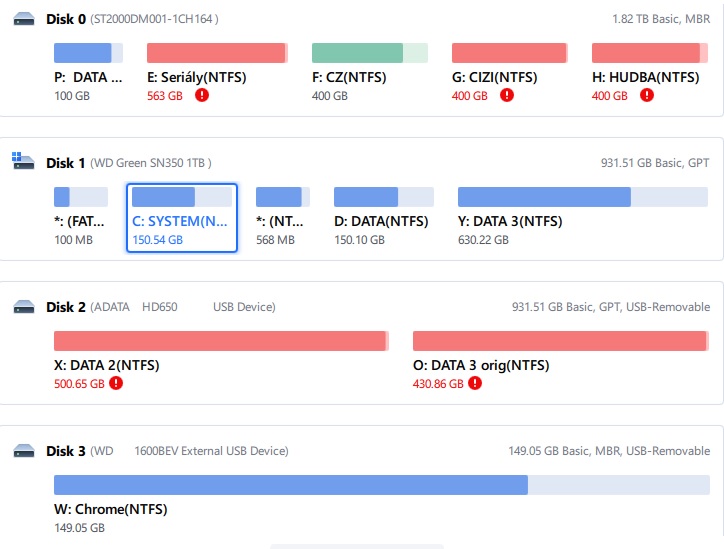 Pokud jsou a stejném disku Windows a data, tak vždy doporučuji disk rozdělit na C a D. Výhodu to má v tom, když chci přeinstalovat Windows, tak nemusím řešit kam dát data z D. A to samé, když obnovuji oddíl C z bodů obnovy, nebo ze zálohy.