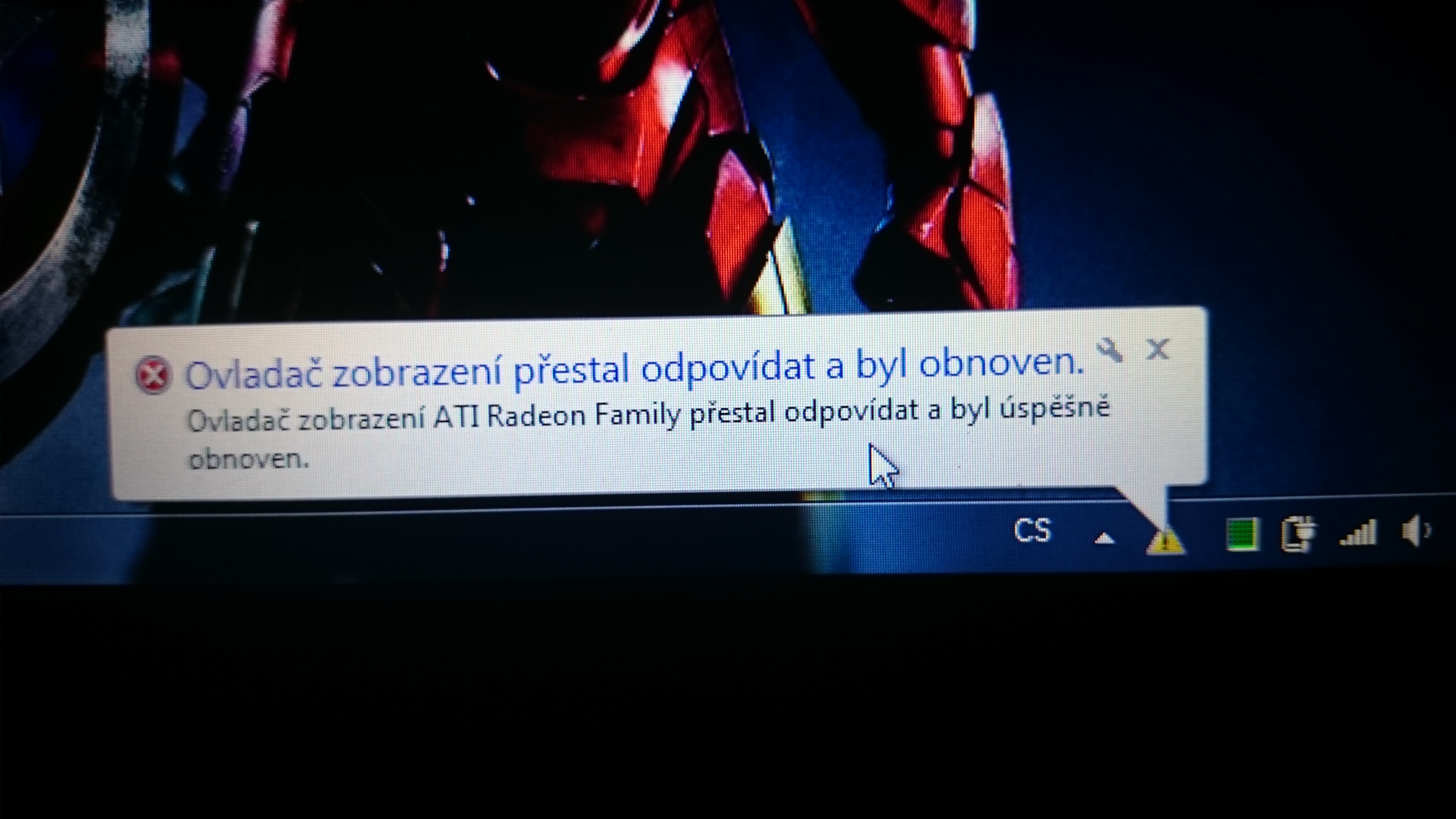 potřebuji poradit. Mám problém s PC a s hraním her. Notebook v pořádku funguje celý dny v provozu, ale když si zapnu mojí oblíbenou hru World of Tanks, tak cca. po 20 min. (2 bitvy) hra úplně spadne. Černá obrazovka a notebook občas jde shodit do Windows, kde se objeví upozornění (viz. obrázek). Někdy shodit do Windows vůbec nejde a pomůže jen tvrdý vypnutí. Počítač vydává takový divný zvuk při seknutí ("chrčení").. Jinak hra jede cca. 30-45 fps. Což si myslím že je dostačující.