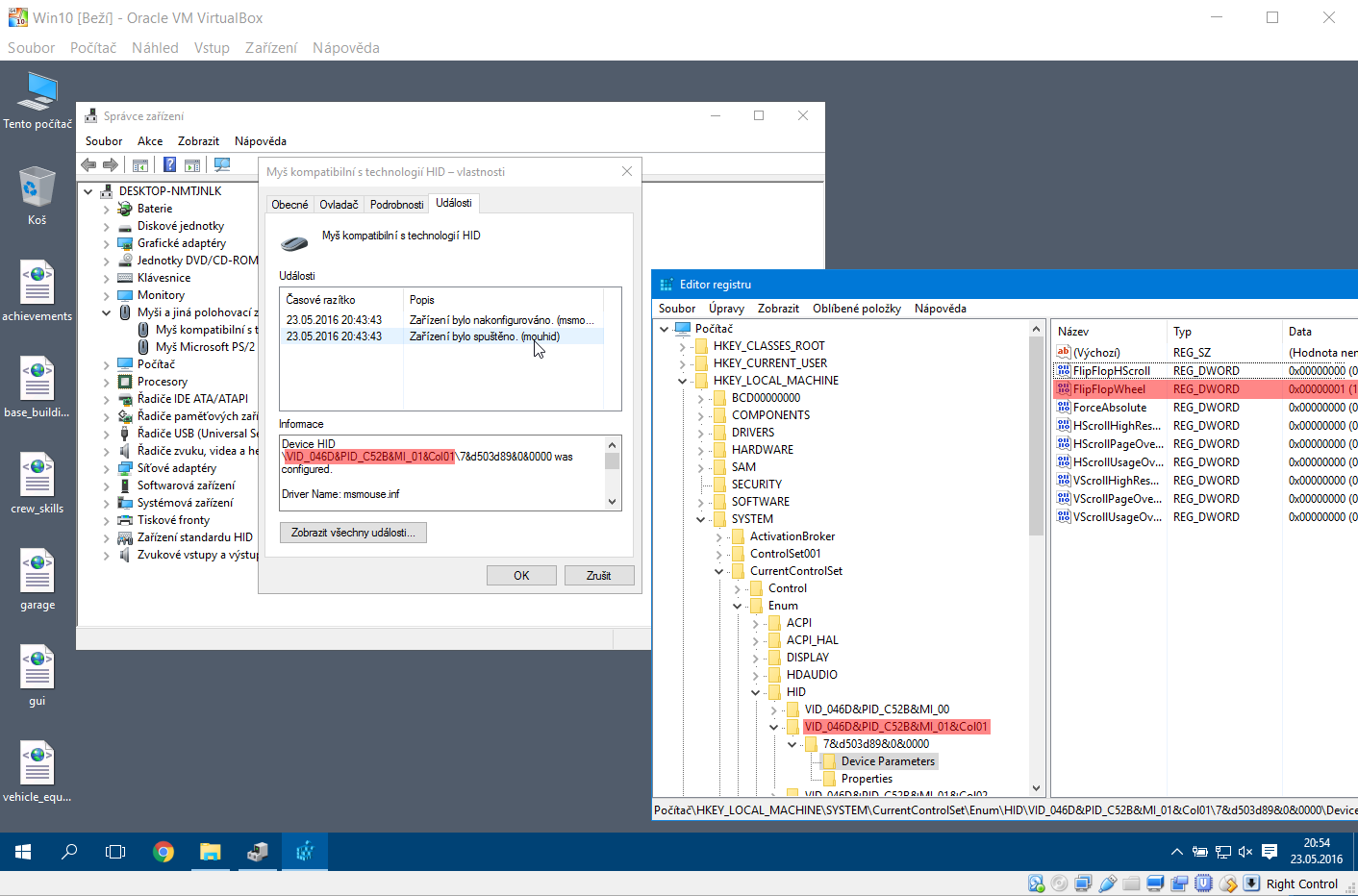 1) Ve správci zařízení si najdeš tu myš a rozklikneš jej vlastnosti > události a tam zjistíš kde je ta myška v registrech (viz obrázek)