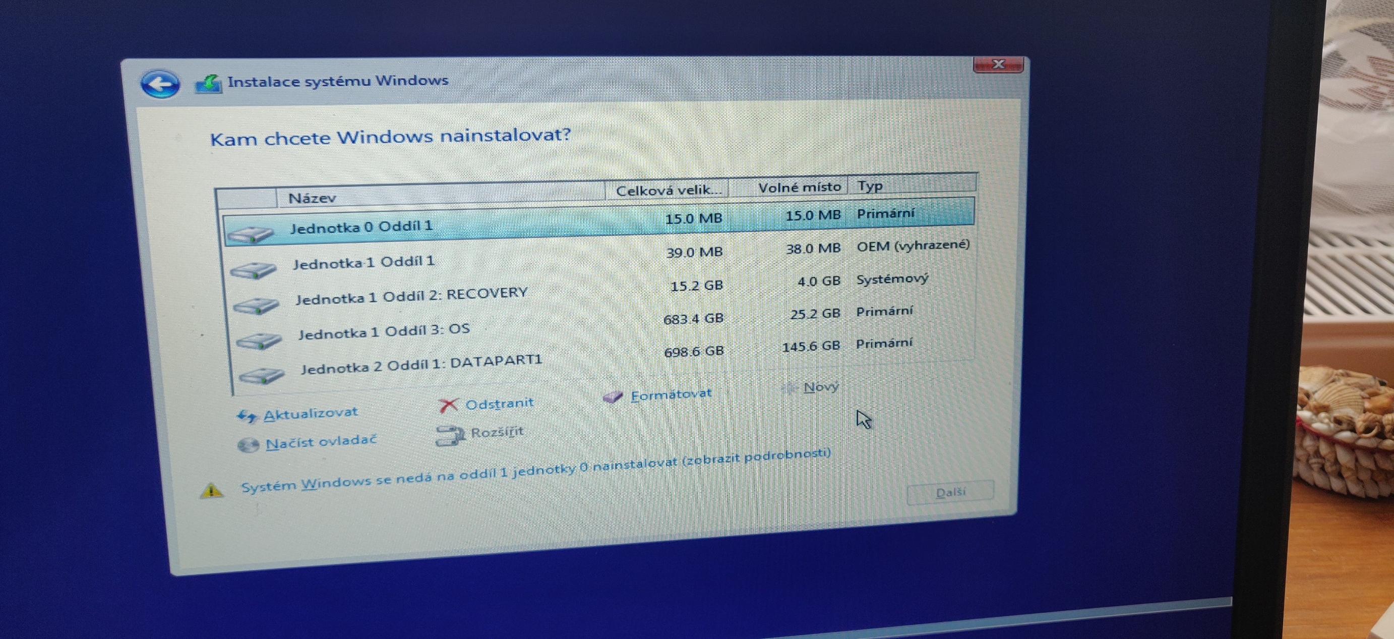 Pokusil jsem tedy nainstalovat win na oddíl 0 poté to ohlásilo že má špatný typ oddílu tak jsem ho změnil ve správci disků ale problém přetrval má někdo nápad?
