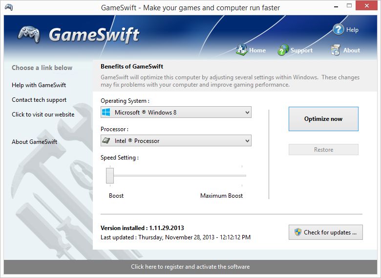 GameSwift sets the standard for PC and game optimization software. A combination of our two products PCMedik and GameGain, GameSwift instantly makes your computer faster and fixes common problems associated with frustrating slowdowns and errors and squeezes out every last bit of your computer performance and games are capable of. Do you remember when you first turned your brand new computer on and how fast it worked? With GameSwift and a click of the mouse you can bring back this speed to your computer instantly. GameSwift quickly scans your computer for common problems and fixes them, it then makes several permanent changes to Windows so your computer feels like it is brand new once again. Don’t deal with a slow computer making tasks take longer to complete, install GameSwift and make your computer run faster.