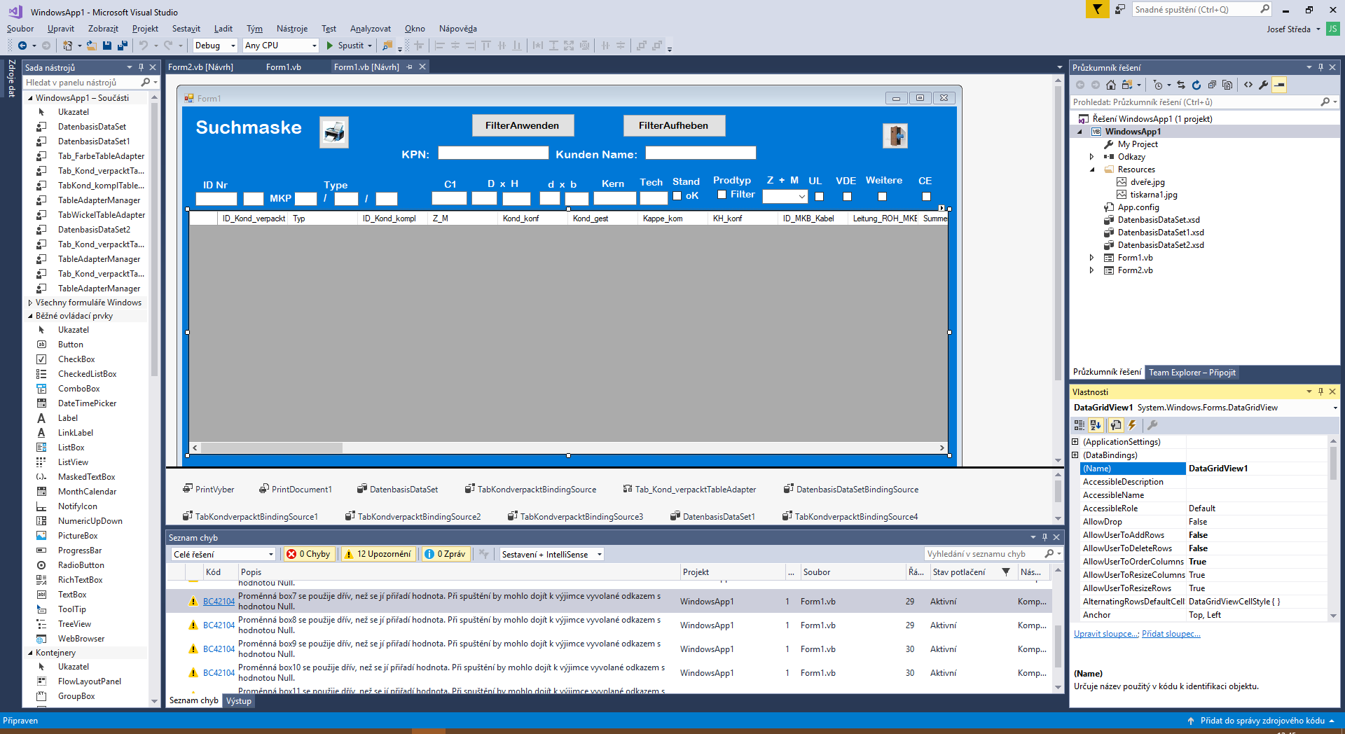 Pracuji na "programu" ve form s VBA který má tahat data z tabulek databáze SSQL. Mám ve formu hozený DataGridView1, pomocí kterého vyobrazuji data přímo z SQL ale potřebui vytvořit filtrování pro tabulku v Gridu. Je lepší použí t nějaké pole do kterého se tabulka naháže a následně bude filtrovat podle potřebných parametrů nebo naházet každej textbox a checkbox zvlášť do proměný ? přikládám prtscn jak to aktuálně vypadá a potřeboval bych aby tlačítka filter pracovala nezávisel na sobě a obě brali v potaz každý nástroj nad tabulkou dohromady.
