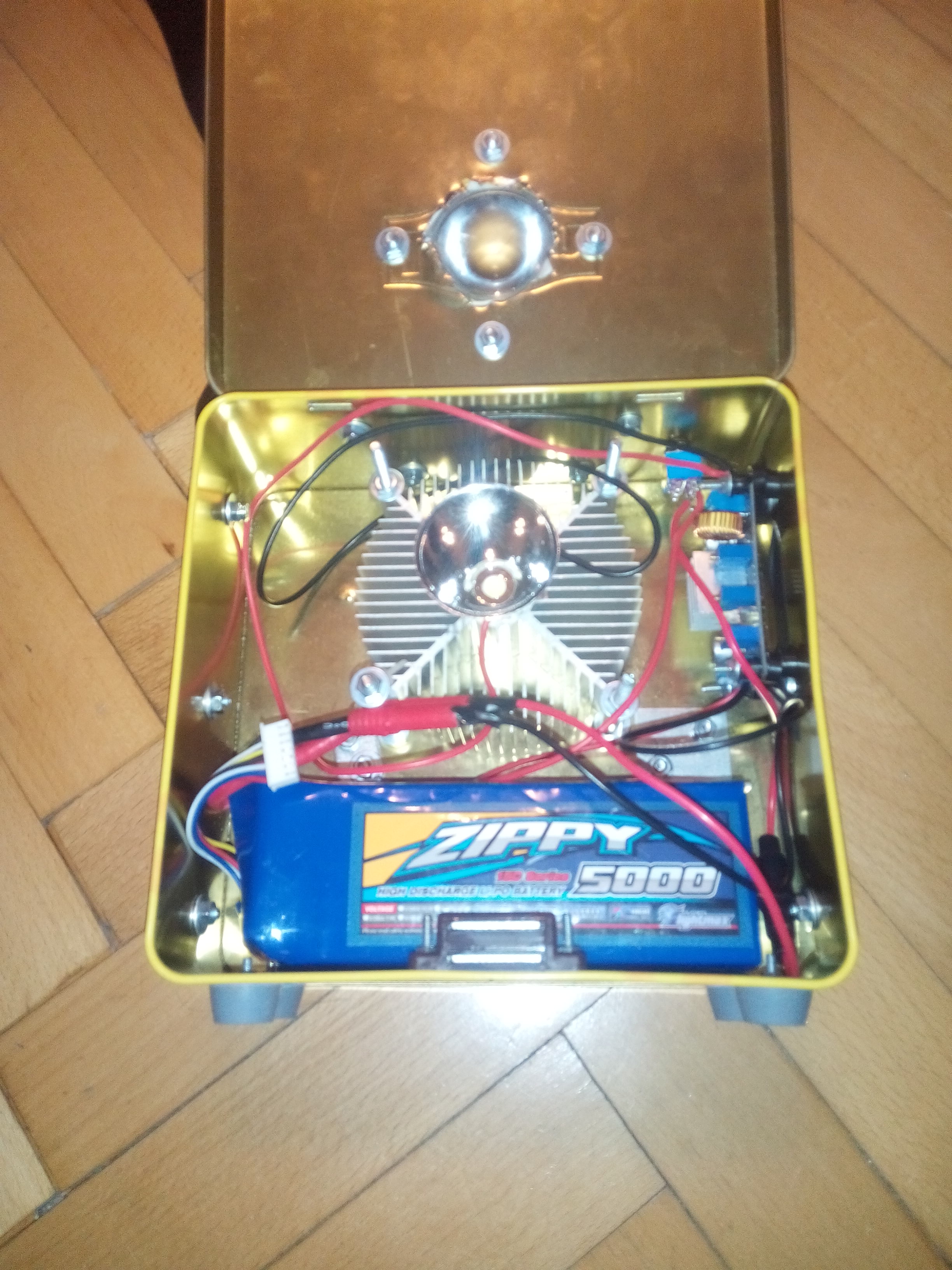 I když nadpis vlákna je "Na čem pracujete ? Pochlubte se :-)", tak nechci postovat jen věci, co sem přesně patří, ale i něco málo dokončeného. Před rokem jsem si udělal jednoduchou svítilnu svítilnu z krabice od čaje. Použitelný dosvit má tak 30 m. Rízení výkonu nemá, použitý čínský driver umí jen 3A a použitá je jedna z nejvýkonějších současných malých ledek od Cree XHP70 (30W). S přehledem by zvládla i 6A, ale žádná DC/DC měnič co umí alespoň těch 6A doma nemám a kupovat jsem ho nechtěl - je téměř celá z šuplíkových zásob.