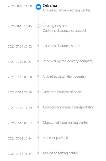 Prvni zasilka byla od 19.7. do 16.8. na celnim rizeni v Lutychu (!) a ted je na ceste