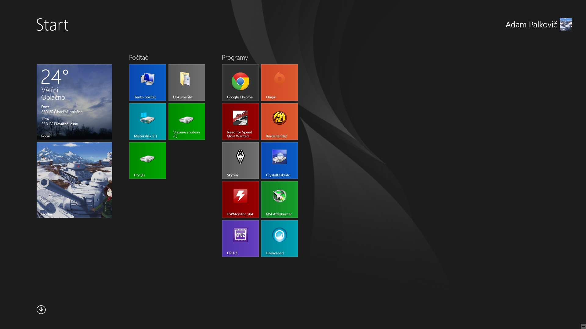 Moje plocha a Metro úvodní obrazovka. Musím rict ze na taskbar nahoře jsem si rychle zvykl :smile: