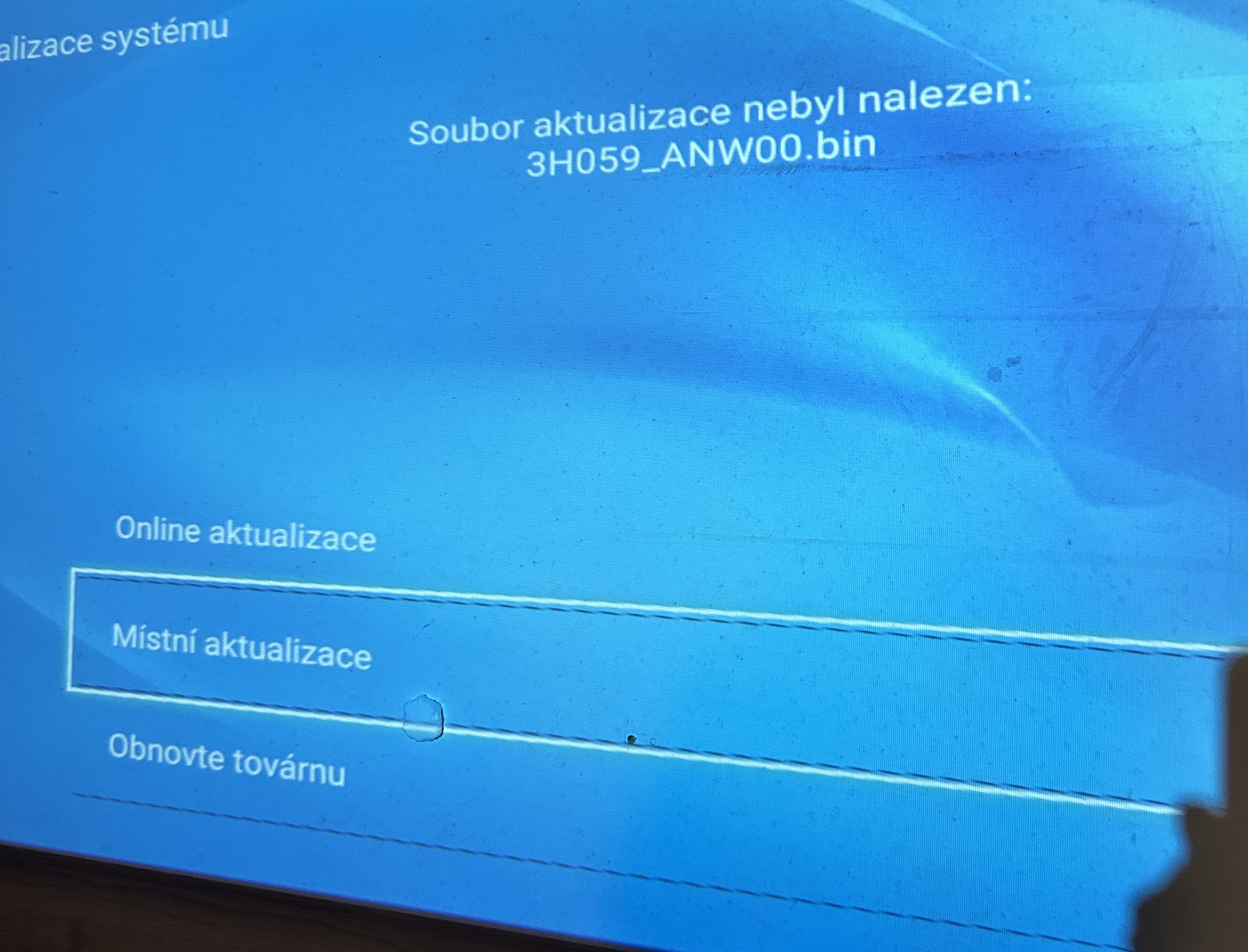 Zdravím a jdu za vámi s prosíkem o pomoc, nedávno sem si koupil projektor, jako fakt super věc, ale, jak sem se hrabal v nastavení a tak prostě zkoumat novou věc však to znáte, co to umí co neumí a co to vše dokáže sem narazil na jednu věc a to aktualizace, když najedu na aktualizaci systému tak on-line aktualizace je ok ale když najedu na místní aktualizaci vyskočí na mě toto “Soubor aktualizace nebyl nalezen: 3H059_ANW00.bin”, a já ten soubor nemohu nikde za boha najít a ani internet mi nic o takovém souboru nedokáže najít nic, s**ru se tu s tím už asi 2 dny a ne a né přijít na něco co by mě někam dovedlo, prosím váš lidičky dokáže mi někdo poradit o jaký soubor se jedná, kde ho najdu a jak to dám dohromady ?