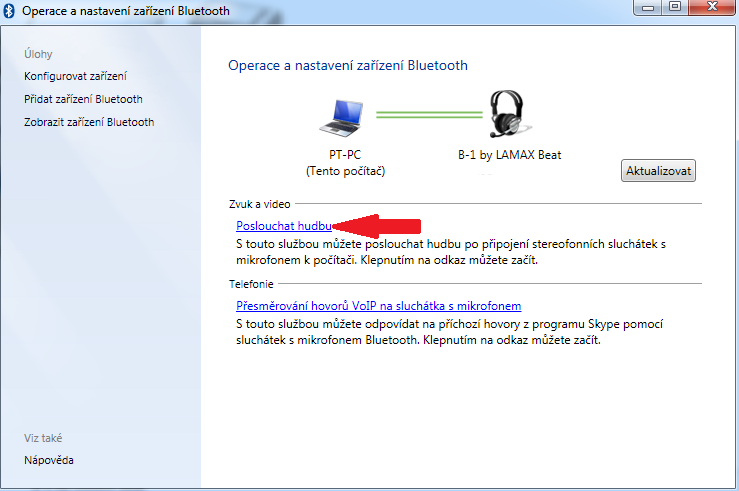 Takže jak jsem psal, když si najdeš zařízení v ovládacích panelech. Dvakrát poklepeš na to zařízení a otevře se ti tohle: Klikneš na poslouchat hudbu a hudba mi začne hrát ve sluchátkách, ale je možný, že to máš jinak.