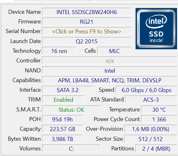 Pozri sa na disk cez Intel® Solid State Drive Toolbox https://www.intel.com/content/www/us/en ... olbox.htmlA môžeš sem dať screen z Device programu SSD-Z.http://aezay.dk/aezay/ssdz/
