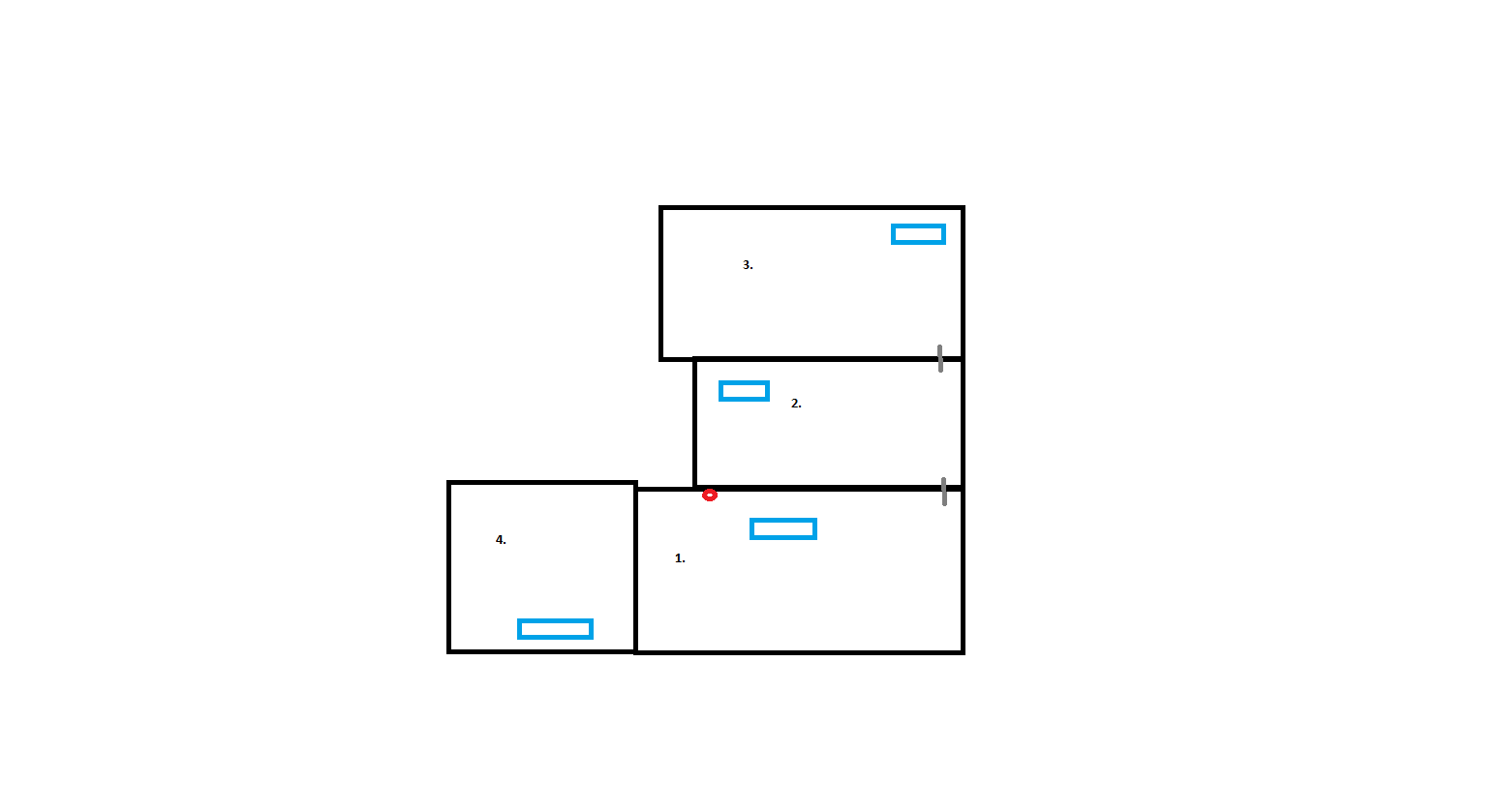 Účastnická zásuvka STA "ve zdi" - redukce F-IEC úhlová! - cca 50cm (dle potřeby) koax s F-konektory - rozbočovač 2/1 Toner XGHS-2D31 č.1(R1) - z jednoho výstupu R1 koax s F-kama skrz zeď do blízkosti TV 2 - rozbočovač 2/1 Toner XGHS-2D31 č.2 (R2) - z jednoho výstupu R2 koak F-F k TV2, z druhýho koax F-F k TV3, k televizím úhlový redukce F-IEC - z druhýho výstupu R1 kousek koax F-F - rozbočovač 2/1 Toner XGHS-2D31 č.3 (R3) - z R3 stejným stylem k TV4 a TV1.