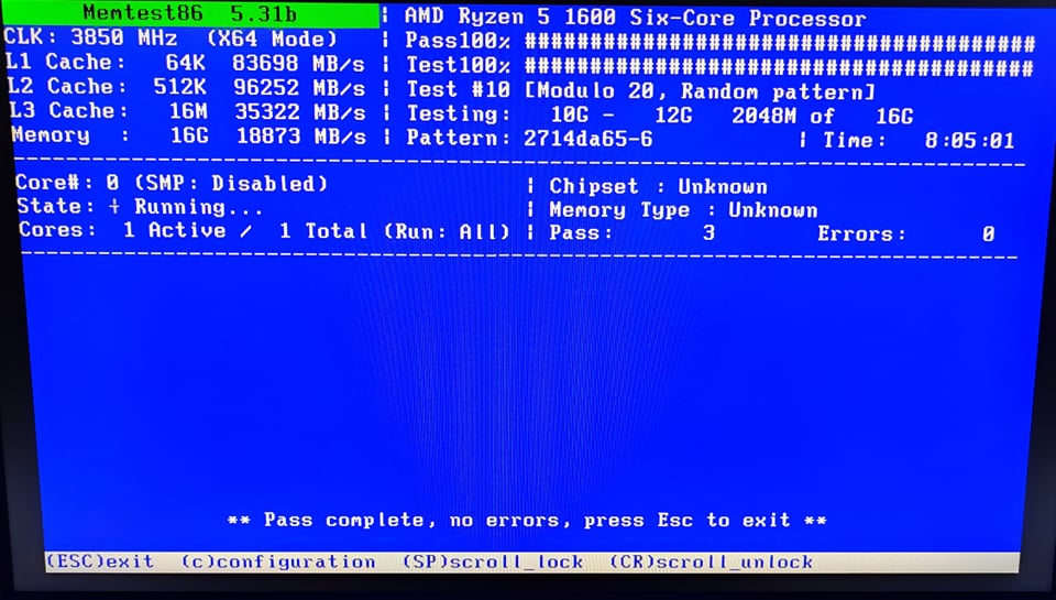 pcmaker jen šmejdí, jinak by si zjistil, že verze memtestu, kterou jsi použil je platná... Memtest86+ V5.31b (12/04/2020). Oni se totiž rozdělili. Jedna půlka se vydala komerční cestou zde: https://www.memtest86.com/ (verze tuším 9.3) projedou max. 3 testy, což je málo (na víc musíš platit). Druhá půlka vyrobila verzi 5.31b, která tesuje pořád, dokud ji nepřerušíš. I ty jsi dal test na pass = 3. Platný test je pass>5. Takže i těch 8 hodin bylo málo.