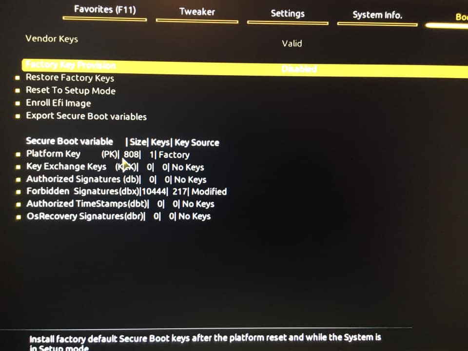 Čo sa týka klúčov, tak platform keys a forbiden signatures nejdu vymazať. Zvyšné sa vymazali do no keys, je to vidieť aj na obrázku