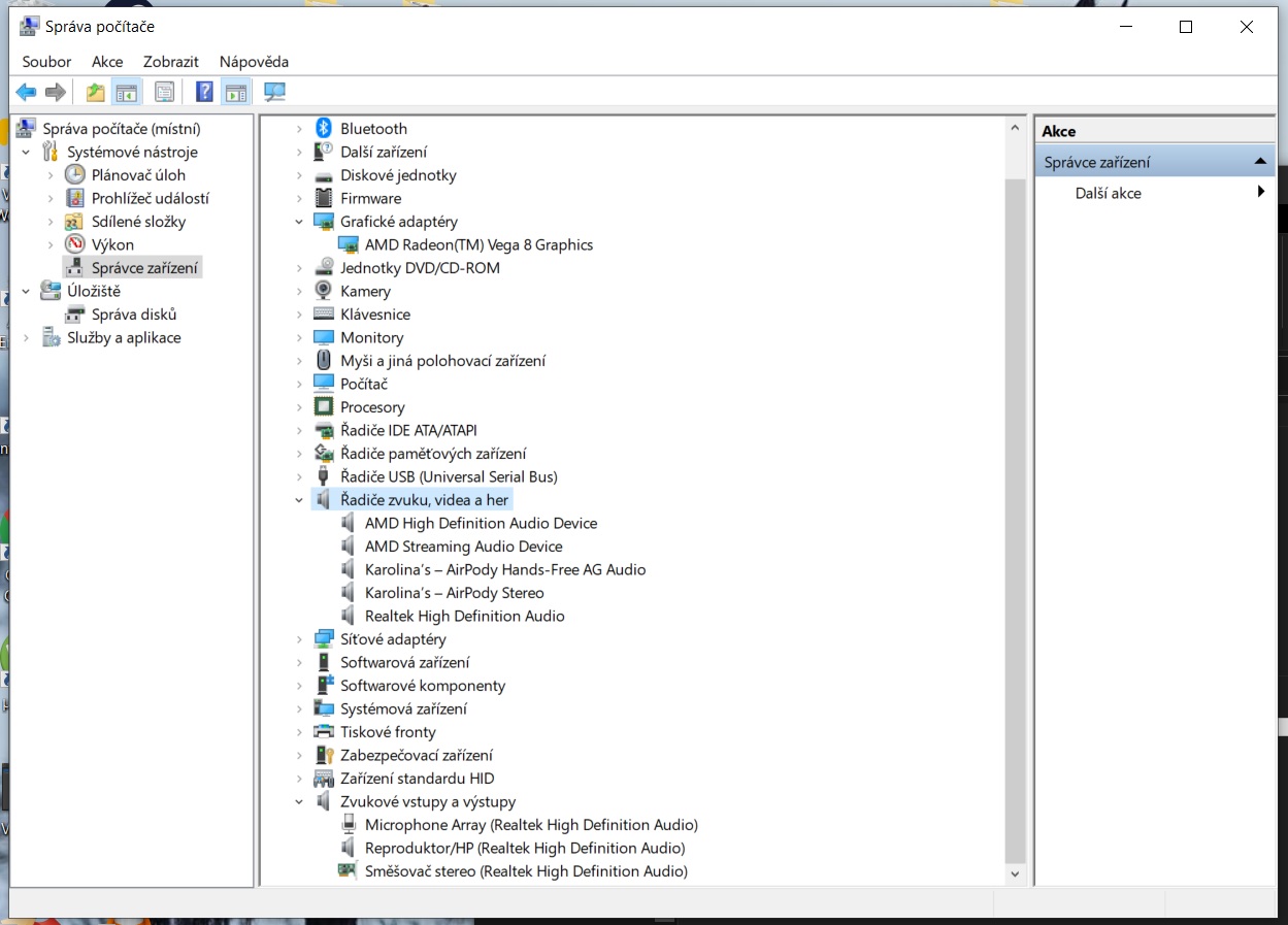 Takto vypadá správce zařízení, a na druhém screenu je nastavení zvuku při připojeném HDMI, bez možnosti změnit na cokoli jiného.