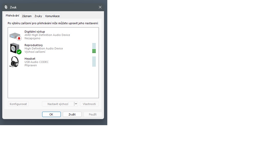 "V nastavení zvuku v notebooku je pro výstup možnost nastavit jen zvukovou kartu notebooku a nic jiného."