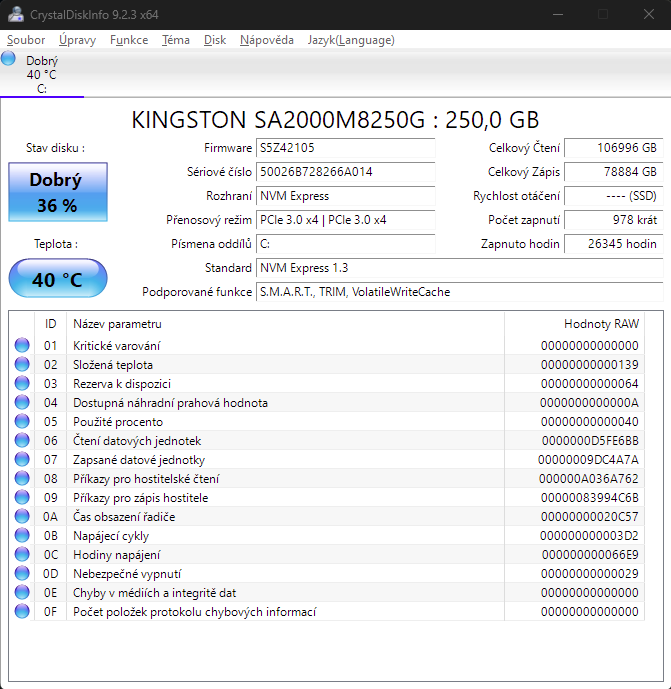 V poslední době mi Windows často hlásí, že nemá dostatek místa. Taky se začalo dít při updatu grafické karty nebo her se leckdy nepovede a musím restartovat PC. Začal jsem i kontrolovat paměť, protože by neměla být tak plná. Teď tam bylo volné necelé giga a po restartu 14gb. Koukal jsem, že v nedávném příspěvku si někdo stěžoval na problém s hard diskem a chtěli jste po něm screenshot z "crystaldiskinfo" tak přikládám obrázek. Snad to pomůže a urychlí řešení. Jen si nejsem jistý, že to je opravdu SSD, tak prosím jen o potrvzení. Případně tip na nový SSD.